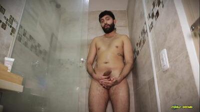 Hot Big Uncut Cock Daddy Camilo Brown Edging In The Shower And Shooting His Cum