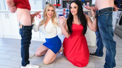 What would happen if three families each contributed one member to create a new family? In this episode of Family Swap, it’s a spooky season and Xxlayna Marie and her swap mom Gianna Grey are really getting into the spooky spirit. They call in swap dad Will Pounder and swap brother Codey Steele to ask if they’ve ever used a spirit board before. The guys are skeptical, but the girls coax them into playing. They ask what kind of a spirit they’re talking to, and they learn that it’s a sex entity. This prompts Xxlayna to share a dream about a creepy dream she had so they can ask the spirit additional questions.Things get super creepy, with the lights flickering. Next thing Xxlayna and Gianna know, their costumes have been manhandled so their tits are hanging right out! Codey tries to back off, but then his cock mysteriously pops out of his pants. Will’s dick is the next to make an appearance. The girls exchange a look and realize that they’re both into their well-hung swap fam, so why not make the best of it? Gianna takes Will in hand and mouth, while Xxlayna does the same for Codey as they kick off a haunted swap family fuck fest.The spirits clearly want this swap family to get it on, and they’re all happy to comply. Gianna climbs aboard Will’s cock in reverse cowgirl while Xxlayna mirrors the position on Codey. Then Xxlayna gets on her knees so Codey can bang her from behind while Will does the same for Gianna. The girls swap partners so Will can fuck Xxlayna as she lays on her back for him and Codey can give it to his bigtit swap mama. The guys each glut their partners with a big fat creampie, which will hopefully placate the swap house’s sex spirits.